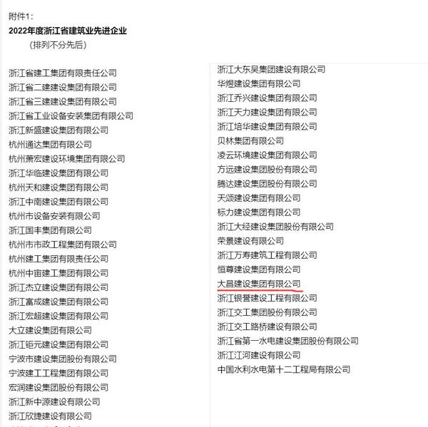 日前,浙江省建筑业行业协会公布了2022年度浙江省建筑业先进企业、优秀企业家和优秀建造师项目经理的评选结果。集团荣膺2022年度浙江省建筑业先进企业。